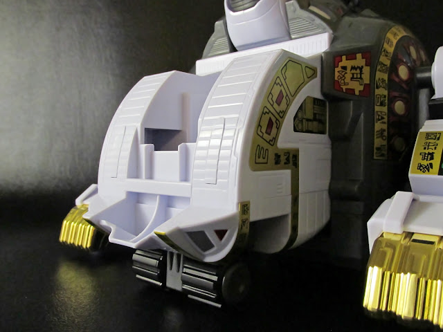 You can see here where some more of the screw hole caps were added, but with the fact that the whole interior of this ha to be altered for the SoC Dragonzord compatibility, you'd thing they could have better sculpted those parts to hide better. At least they tried, I guess. Also, that tampographed pipe detailing... We'll get back to that in a second.